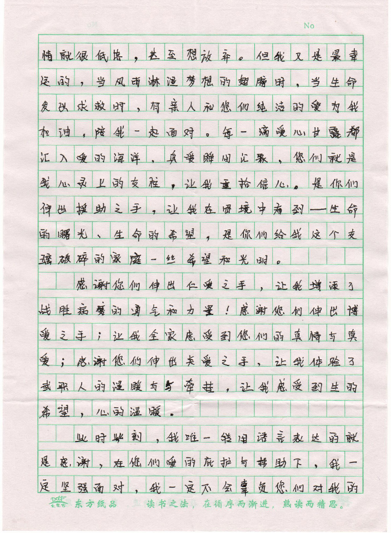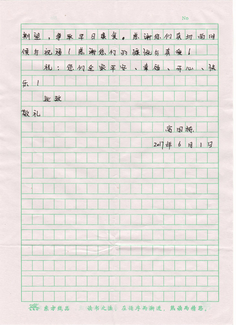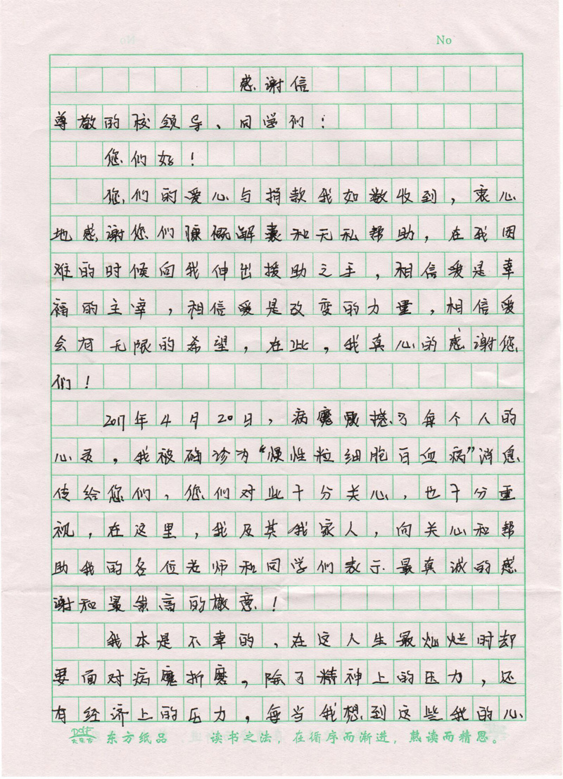 高國棟是我院機(jī)械制造系2015級機(jī)械設(shè)計與制造大專班學(xué)生,于2017年4月確診為慢性粒細(xì)胞白血病。得知這一特殊情況后,學(xué)院宣傳統(tǒng)戰(zhàn)部、團(tuán)委、學(xué)生工作處第一時間向全院廣大師生發(fā)出倡議,號召大家獻(xiàn)出愛心,幫助高國棟同學(xué)度過難關(guān)。學(xué)院廣大師生紛紛解囊,慷慨相助。目前捐助的善款已經(jīng)交給高國棟同學(xué)。為此,高國棟同學(xué)特意寫來感謝信,表達(dá)對母校廣大師生的感激之情。在此,我們衷心祝愿高國棟同學(xué)能在困境中迎難而上,樹立戰(zhàn)勝疾病的信心,爭取早日康復(fù),重返校園。
