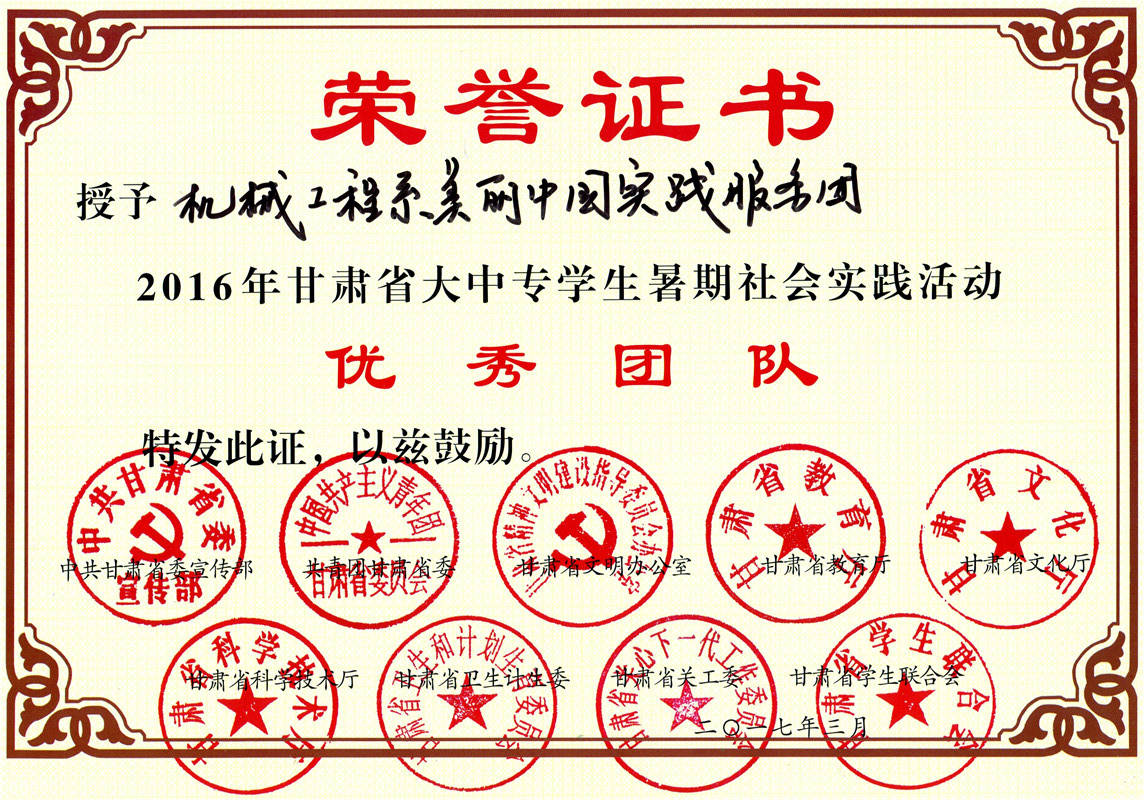 甘肅省大中專學(xué)生暑期社會實(shí)踐活動優(yōu)秀團(tuán)隊---機(jī)械制造系美麗中國實(shí)踐服務(wù)團(tuán)