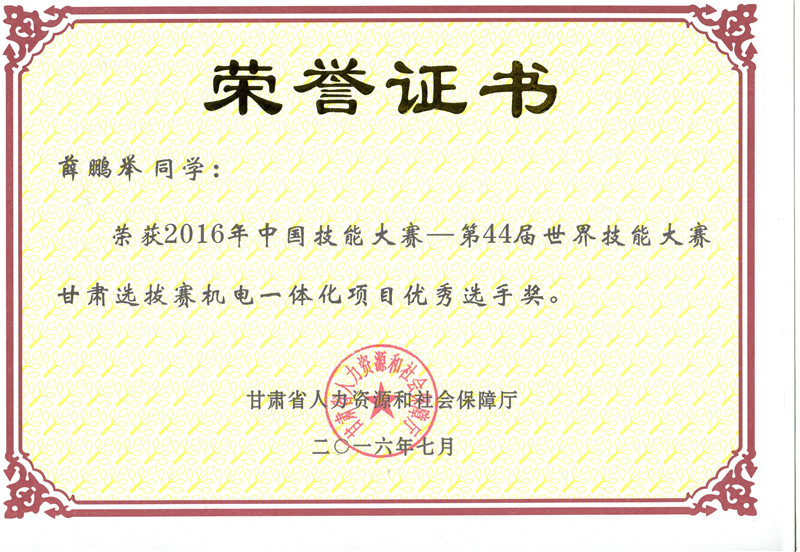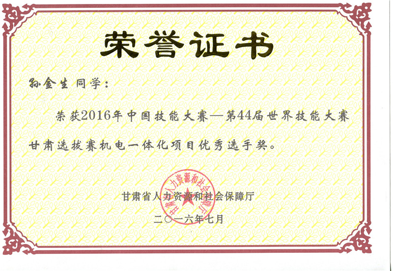 2016年中國技能大賽甘肅選拔賽機電一體化技術(shù)項目優(yōu)秀獎