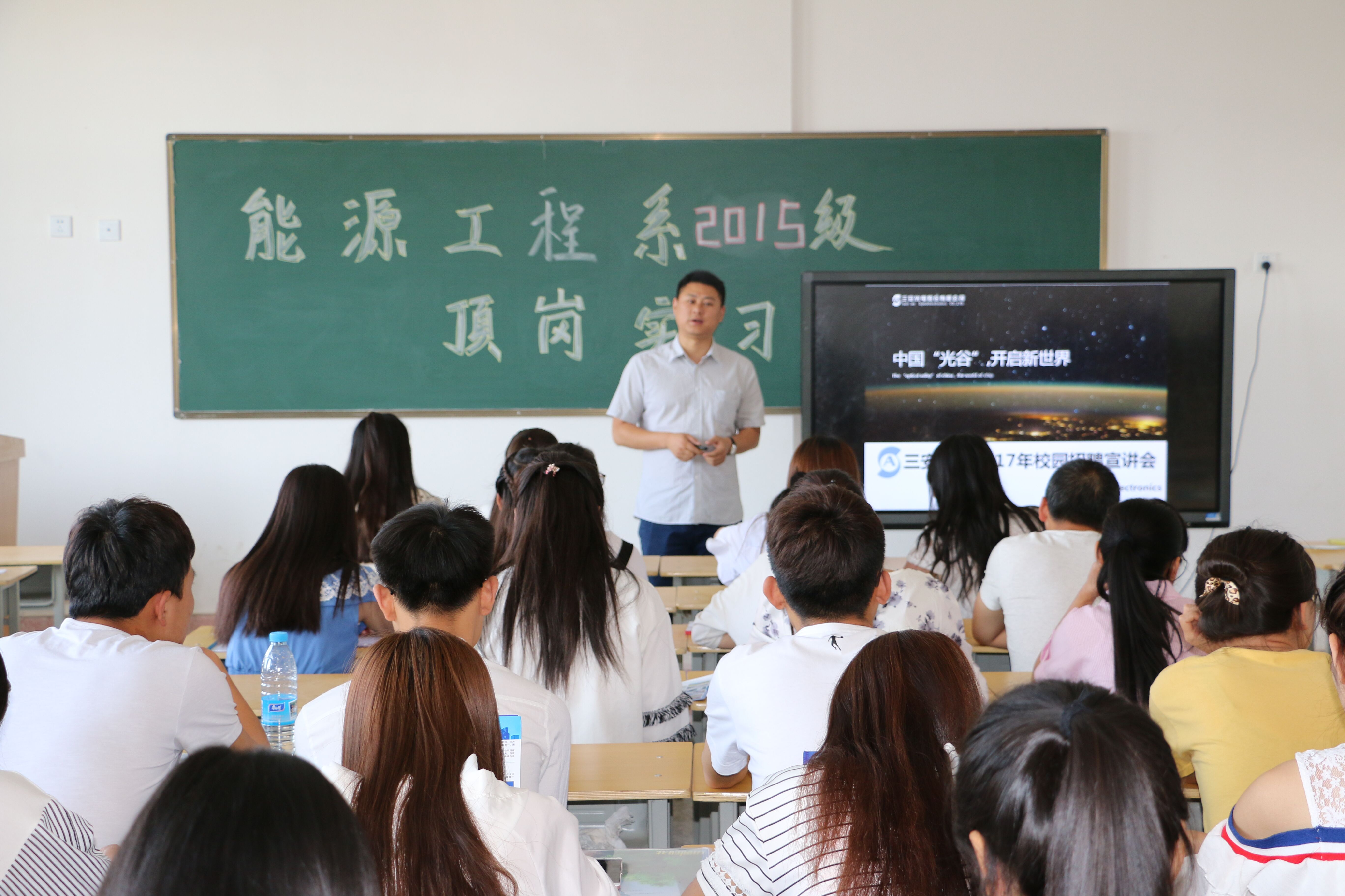 安徽三安光電有限公司在行樹樓504教室開展了頂崗實習(xí)宣講會,2015級農(nóng)村能源與環(huán)境技術(shù)大專班和2015級太陽能光熱技術(shù)及應(yīng)用大專班學(xué)生參加了此次宣講會。李明經(jīng)理就企業(yè)概況、企業(yè)文化、崗位需求、薪酬待遇等方面向同學(xué)們做了介紹,并對有應(yīng)聘意向的同學(xué)進行了面試,最終共有50人被安徽三安光電有限公司錄用。
