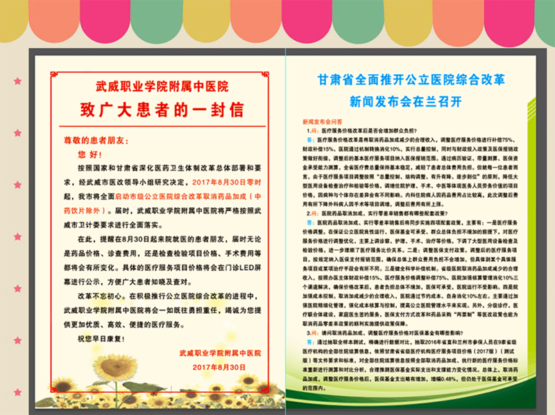 為了搞好公立醫(yī)院綜合改革,醫(yī)院加大對啟動公立醫(yī)院綜合改革工作的宣傳力度,通過醫(yī)院門診大廳LED屏幕、電子顯示屏、宣傳展架、宣傳彩頁及微信公眾號推送等多種方式擴(kuò)大醫(yī)院綜合改革宣傳,對患者及家屬做好正面引導(dǎo)工作,為醫(yī)院綜合改革任務(wù)的落實(shí)營造良好的氛圍。