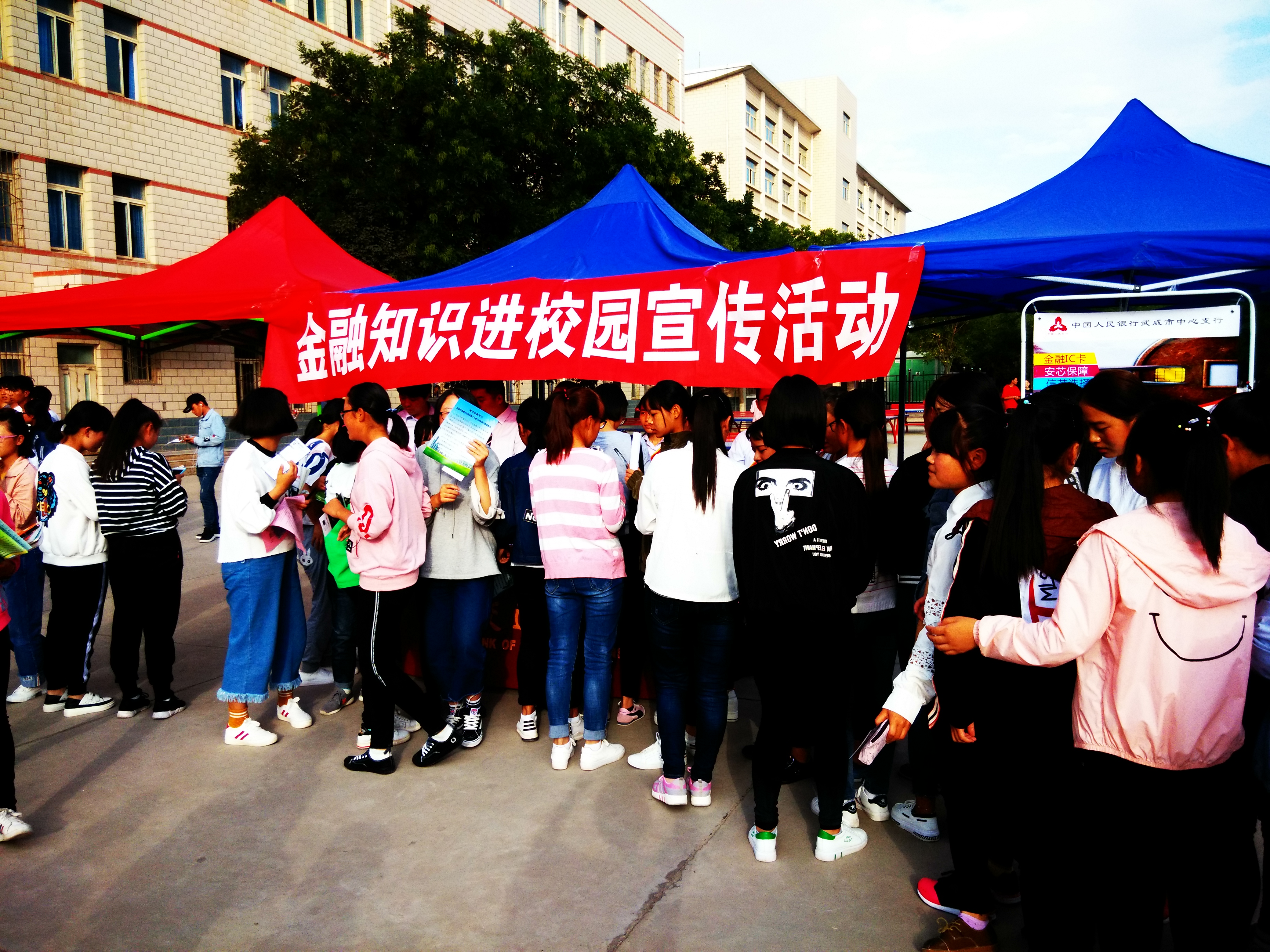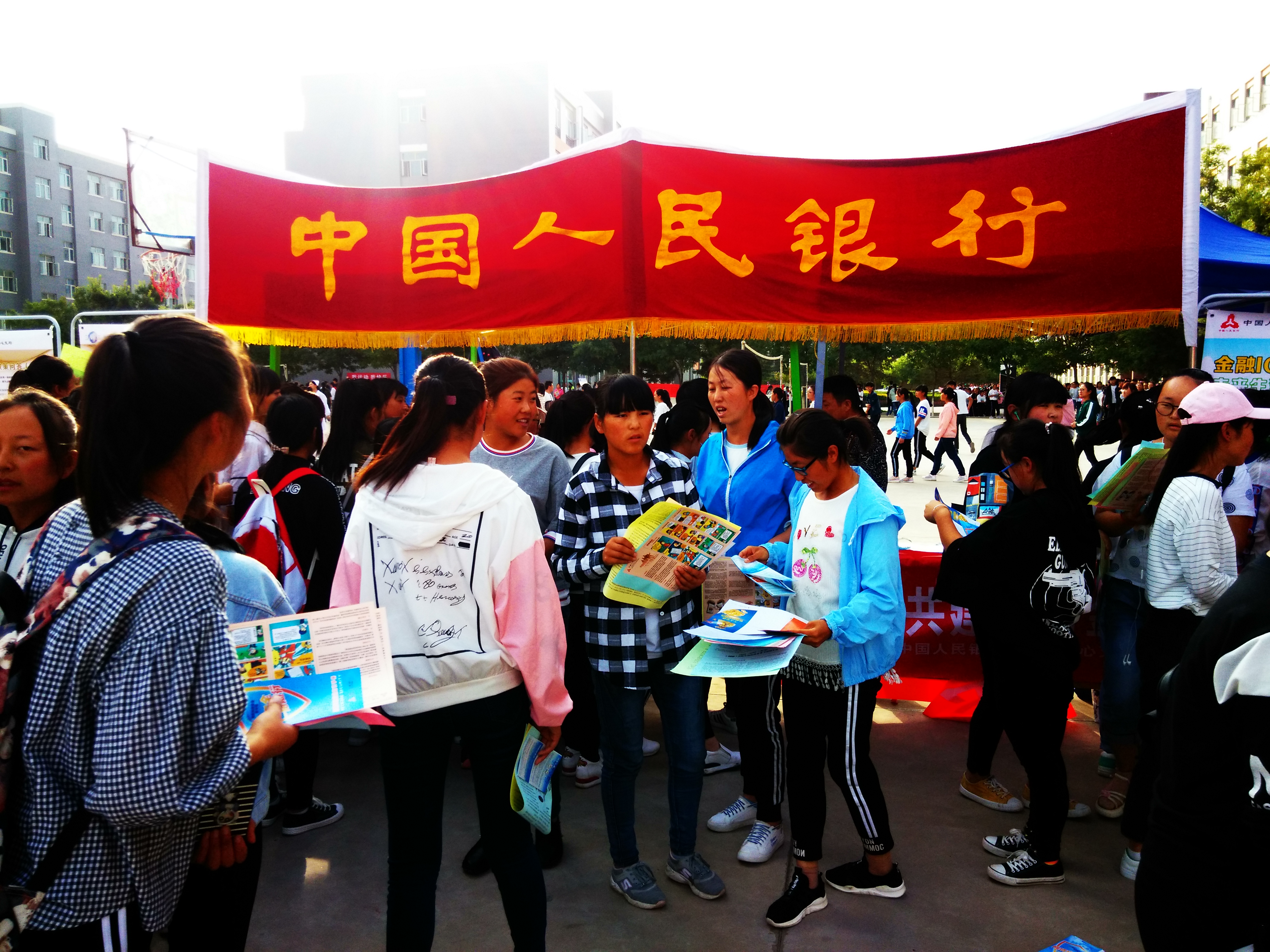 ???? 為幫助和引導大學生群體牢固樹立金融安全意識,9月21日下午,學生工作處邀請中國人民銀行武威分行、武威農商銀行、交通銀行武威分行在學院尚德樓南操場開展了“送金融知識進校園”宣傳活動,全院學生積極響應號召,有1000余人參加了此次活動。