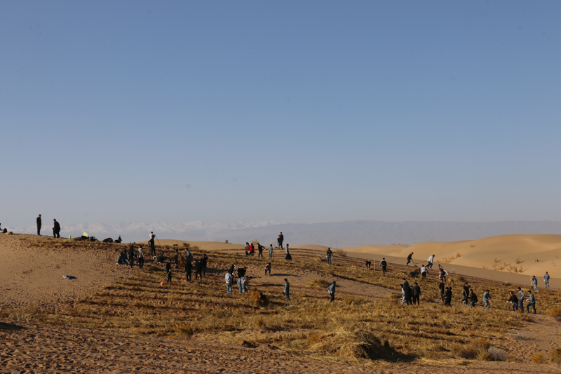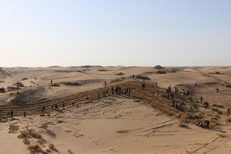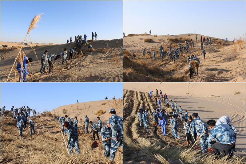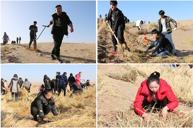 在勞動現(xiàn)場,學(xué)院領(lǐng)導(dǎo)和師生們不畏冬寒,分工協(xié)作,按照標準和要求劃線開溝、蒲草培沙、等距離推進,現(xiàn)場一片熱火朝天的景象?;氖彽纳车厣砼乱?,整齊的稻草方格逐漸向遠處的沙丘覆蓋。