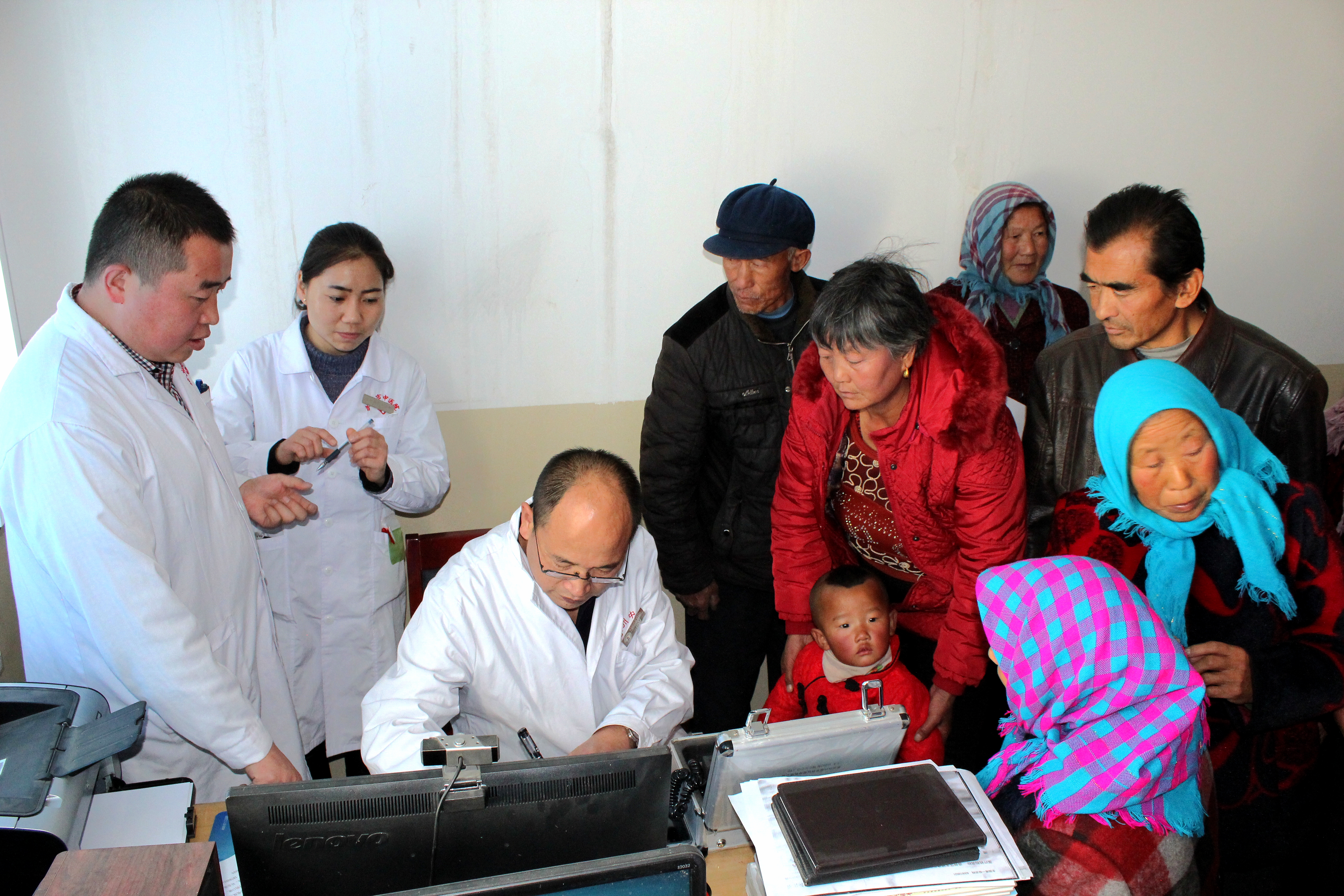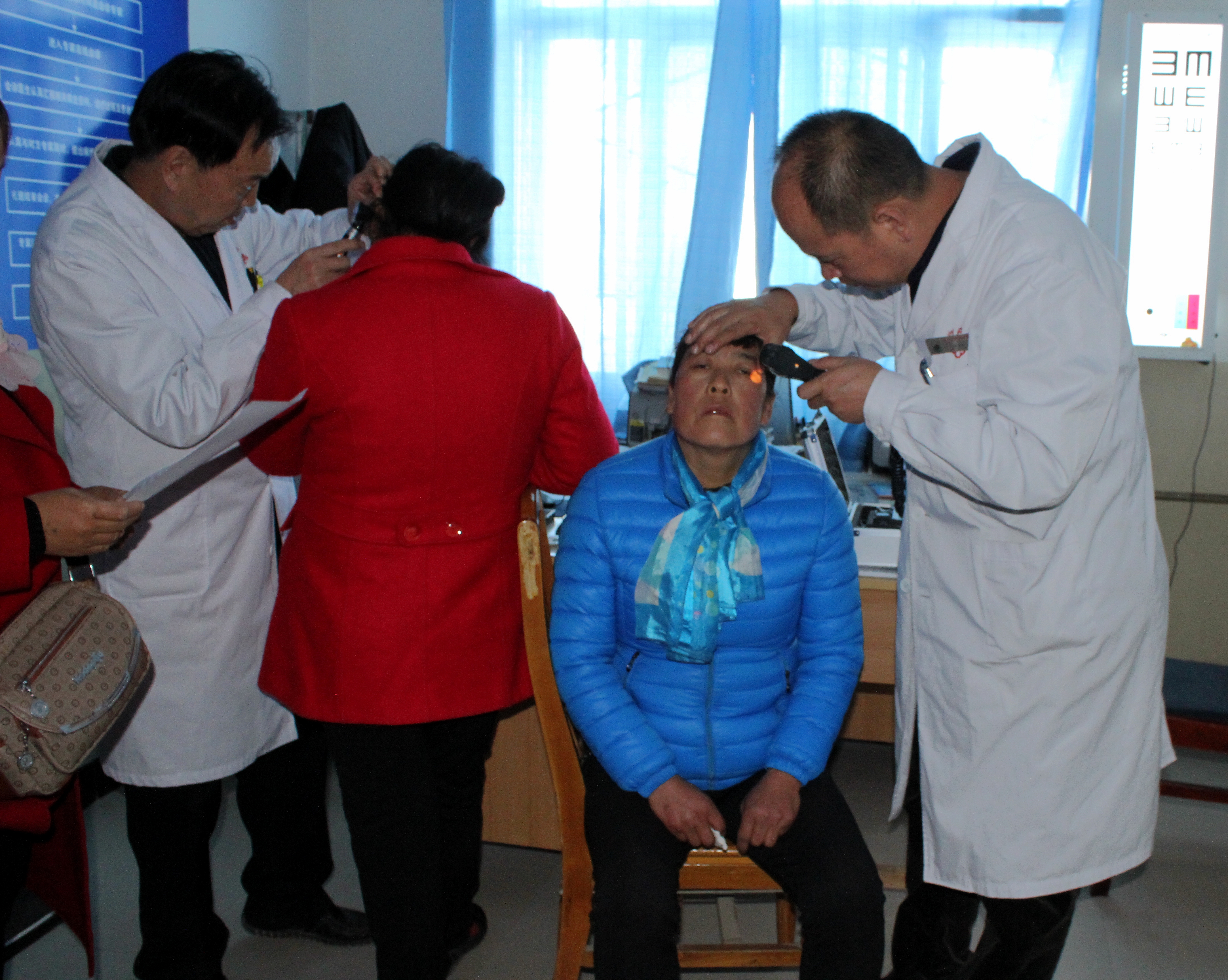 在衛(wèi)生院內(nèi)義診現(xiàn)場,由于診室面積所限,患者們遵照護(hù)士安排意見,按病種分成兩組排隊候診。陶醫(yī)生為患有干眼癥、結(jié)膜炎、白內(nèi)障、青光眼、翼狀胬肉、斜視等眼科疾病的患者開展常規(guī)檢查,并開具處方,提供健康用眼衛(wèi)生和治療方案。王醫(yī)生為患者提供耳鼻喉常規(guī)檢查服務(wù)。對于患有中耳炎、慢性咽炎、耳鳴耳聾、過敏性鼻炎等疾病的患者,王醫(yī)生現(xiàn)場給予用藥指導(dǎo)和今后的治療方案。