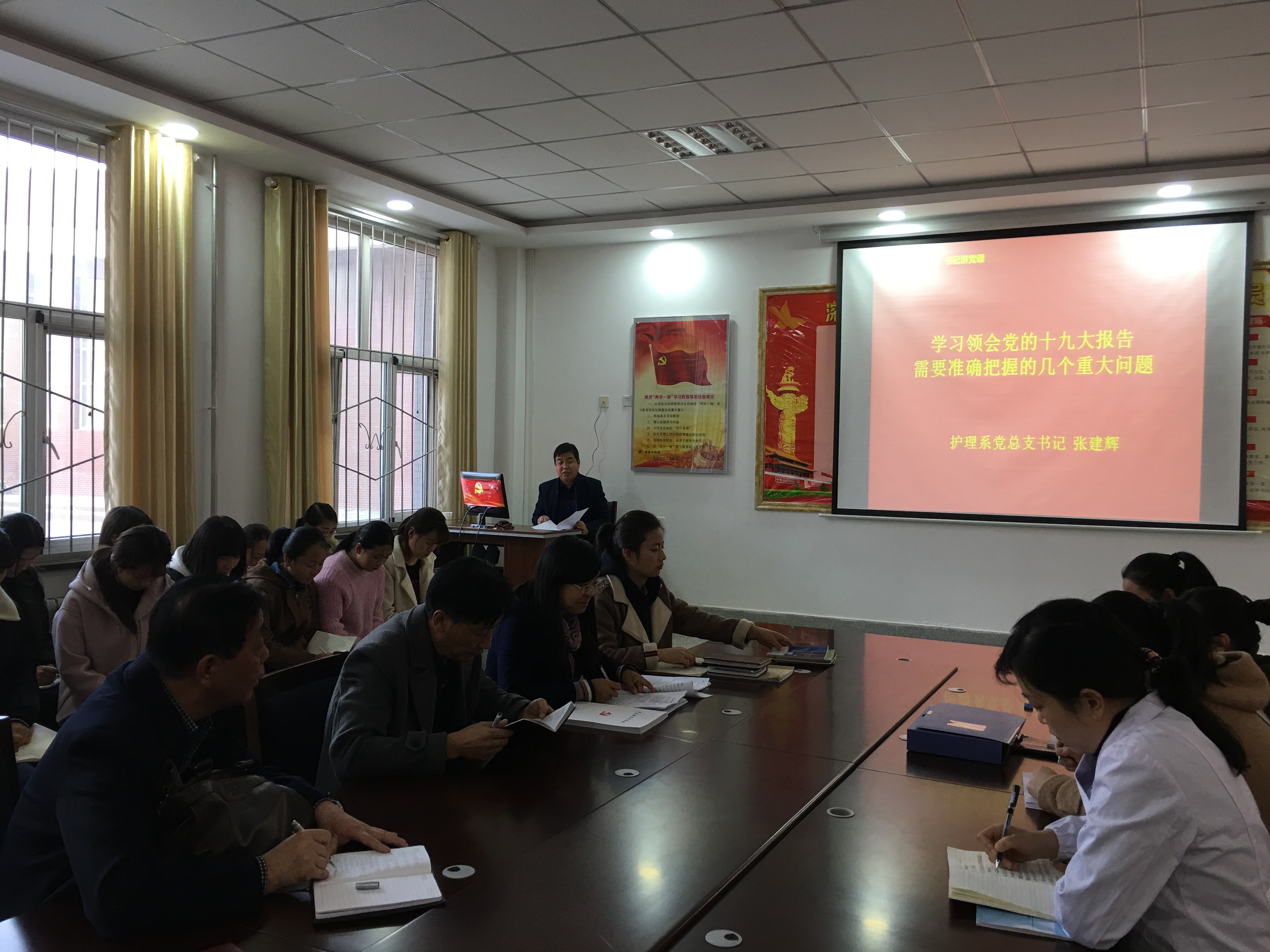 11月17日,護(hù)理系黨支部支召開(kāi)全體黨員大會(huì),黨總支書(shū)記張建輝講黨課,就《學(xué)習(xí)領(lǐng)會(huì)黨的十九大報(bào)告需要準(zhǔn)確把握的幾個(gè)重大問(wèn)題》進(jìn)行專(zhuān)題黨課輔導(dǎo),促進(jìn)全體黨員對(duì)十九大精神的學(xué)習(xí)理解。護(hù)理系入黨積極分子聆聽(tīng)了黨課。