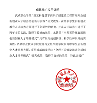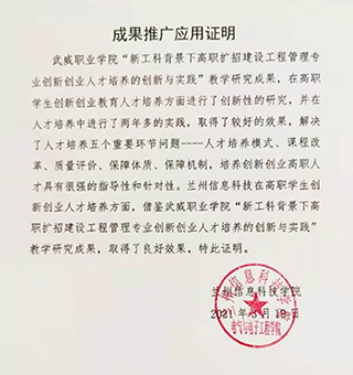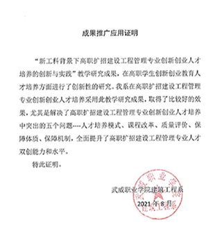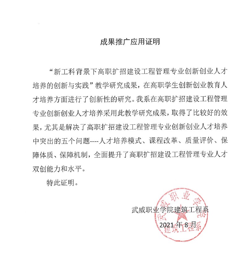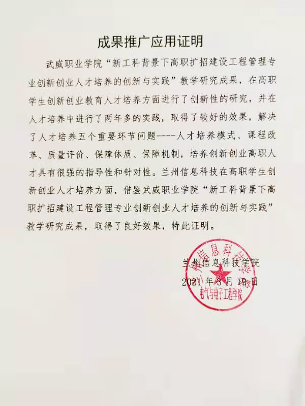 成果推廣應用證明(武威職業(yè)學院建筑工程系)