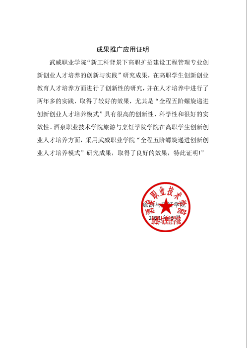 成果推廣應用證明(酒泉職業(yè)技術(shù)學院旅游與烹飪學院)