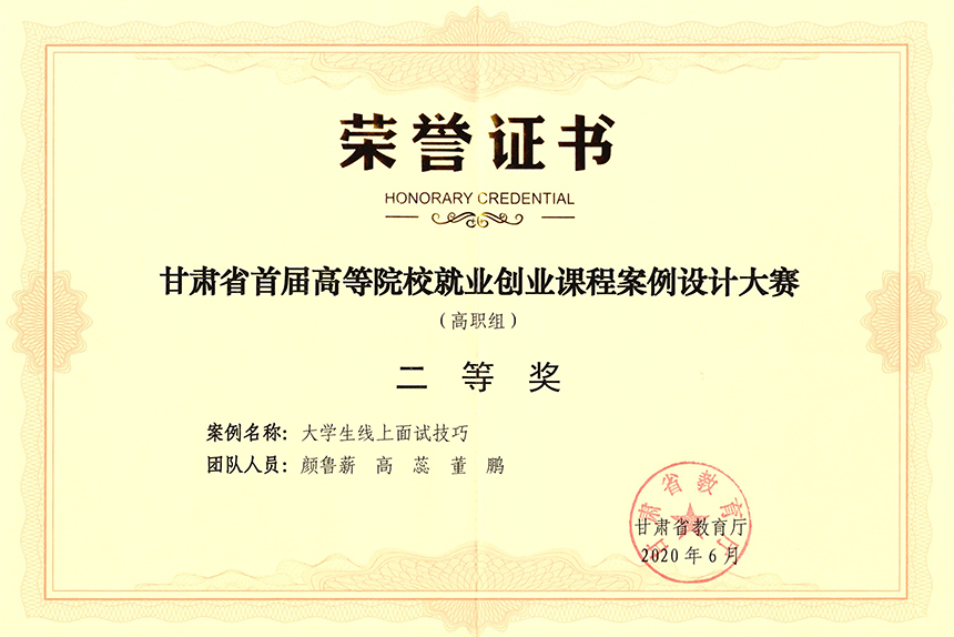 《大學(xué)生線上面試技巧》榮獲甘肅省首屆高等院校就業(yè)創(chuàng)業(yè)課程案例設(shè)計(jì)大賽(高職組)二等獎(jiǎng)