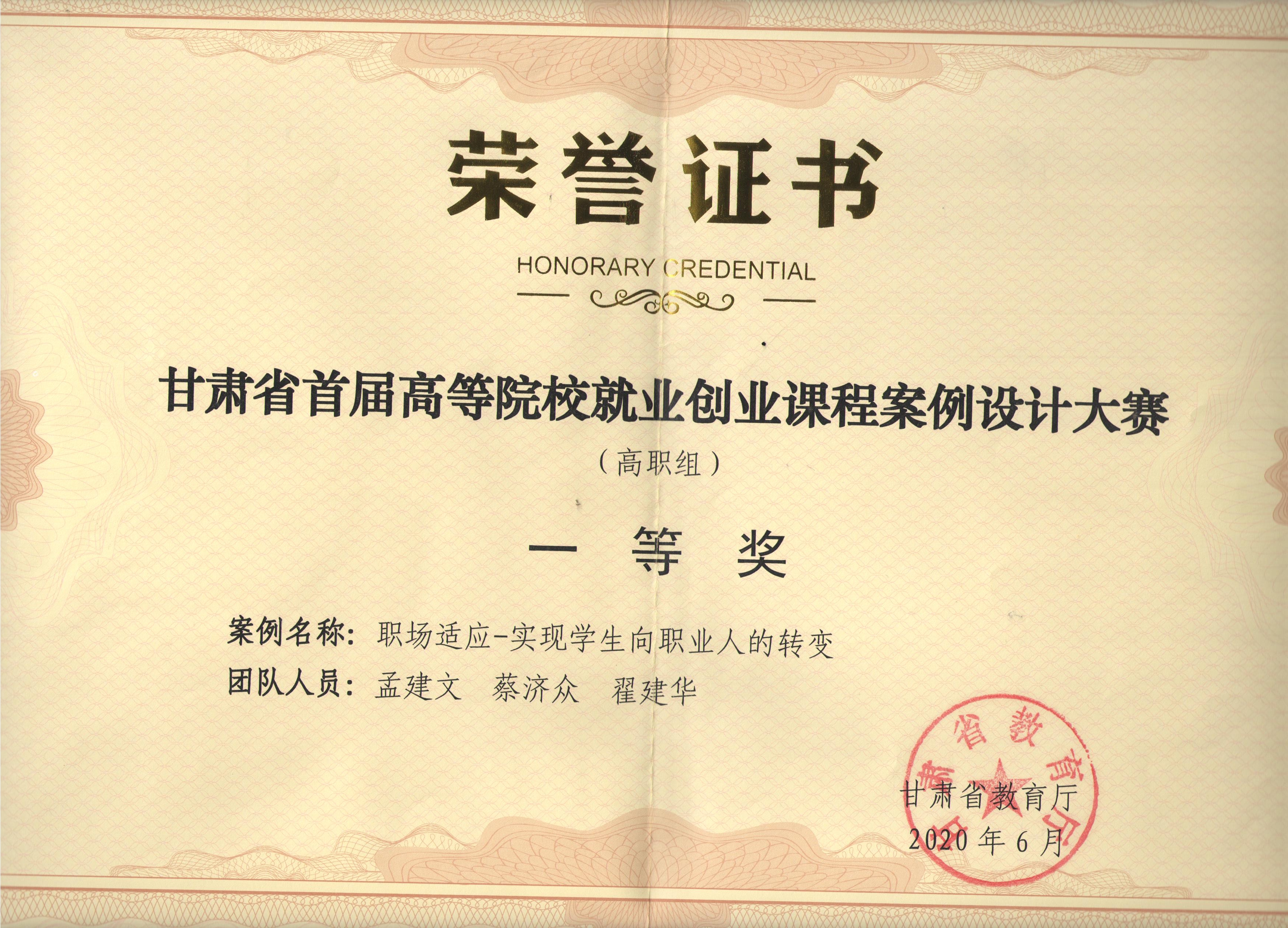 項(xiàng)目組成員蔡濟(jì)眾2020年6月撰寫案例《職場適應(yīng)—實(shí)現(xiàn)學(xué)生向職業(yè)人的轉(zhuǎn)變》榮獲甘肅省首屆高等院校就業(yè)創(chuàng)業(yè)課程案例設(shè)計(jì)大賽(高職組)一等獎