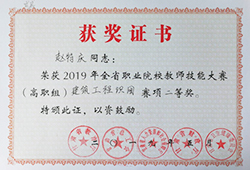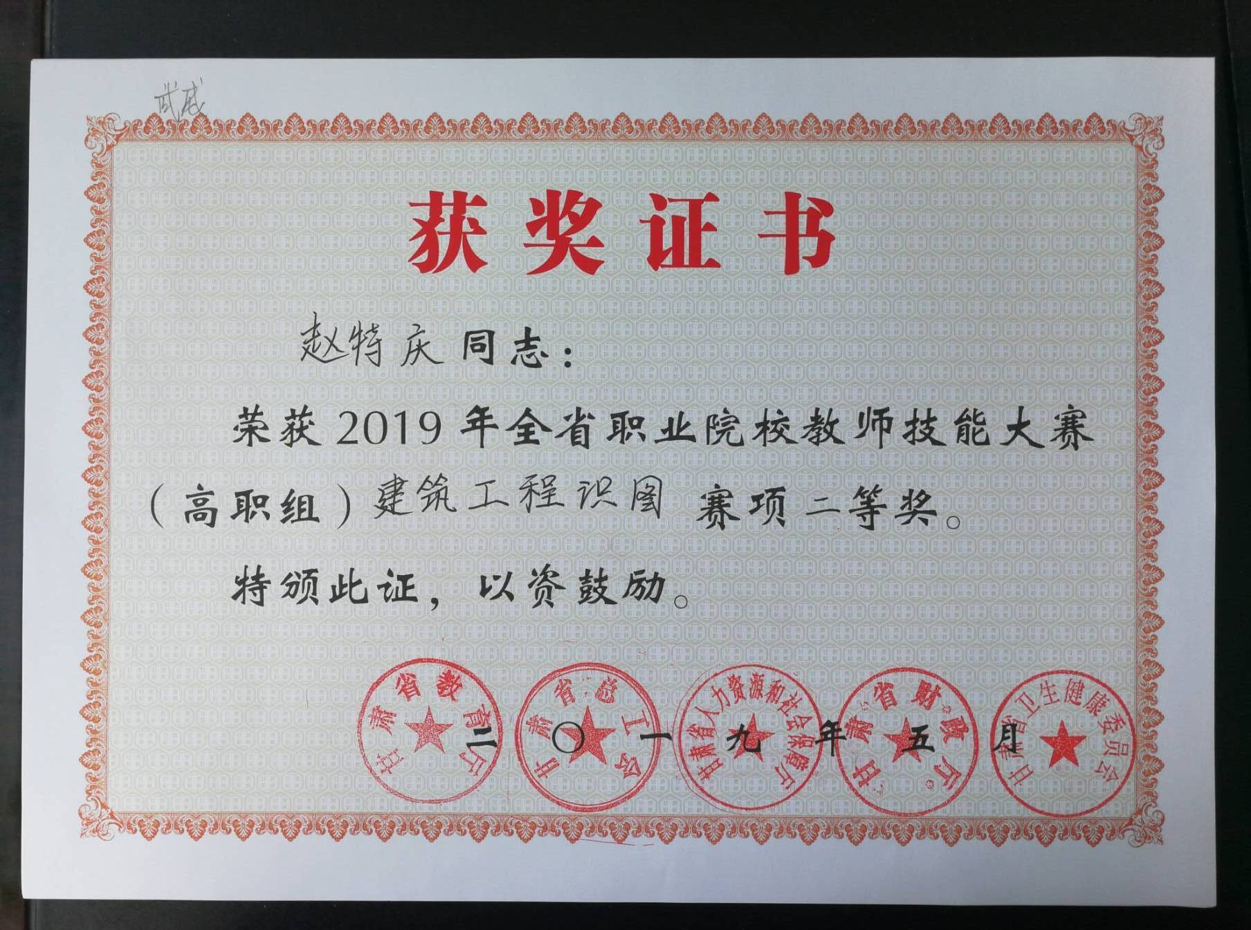 2.項(xiàng)目組成員趙特慶2019年5月榮獲2019年全省職業(yè)院校教師技能大賽(高職組)建筑工程識圖賽項(xiàng)二等獎