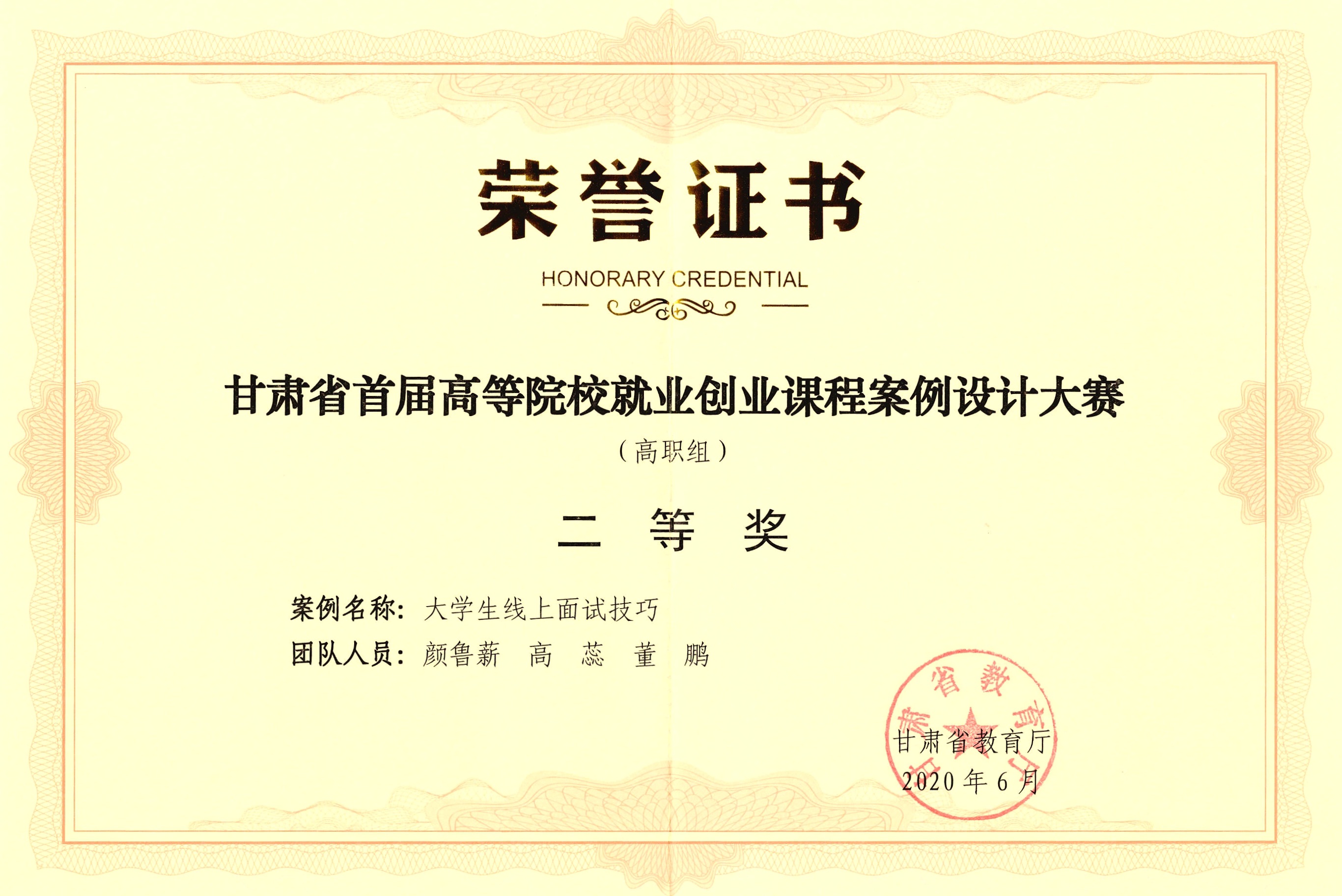 項(xiàng)目組成員董鵬2020年6月撰寫案例《大學(xué)生線上面試技巧》榮獲甘肅省首屆高等院校就業(yè)創(chuàng)業(yè)課程案例設(shè)計(jì)大賽(高職組)二等獎