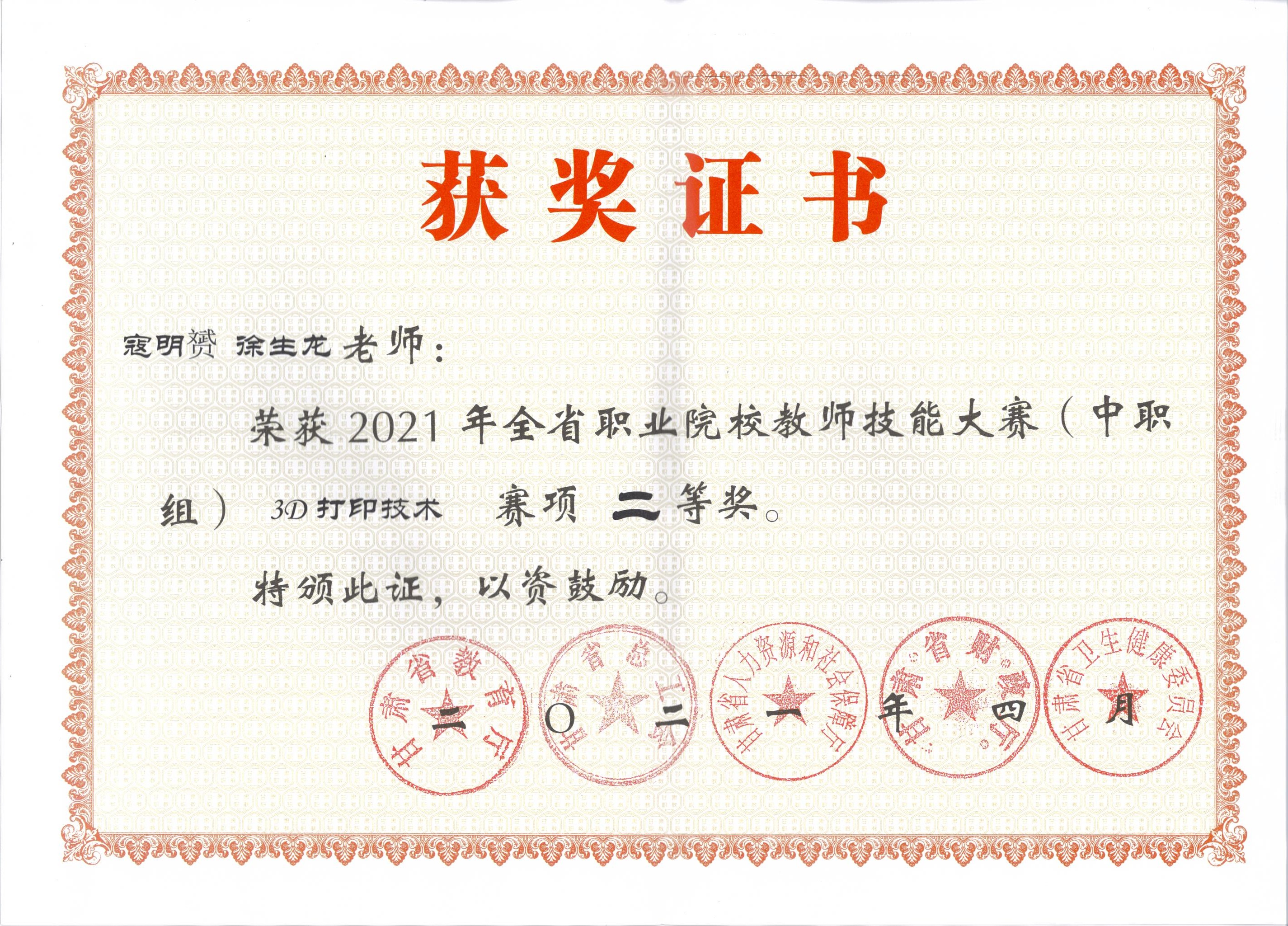 項(xiàng)目組成員徐生龍2021年4月獲甘肅省技能大賽二等獎