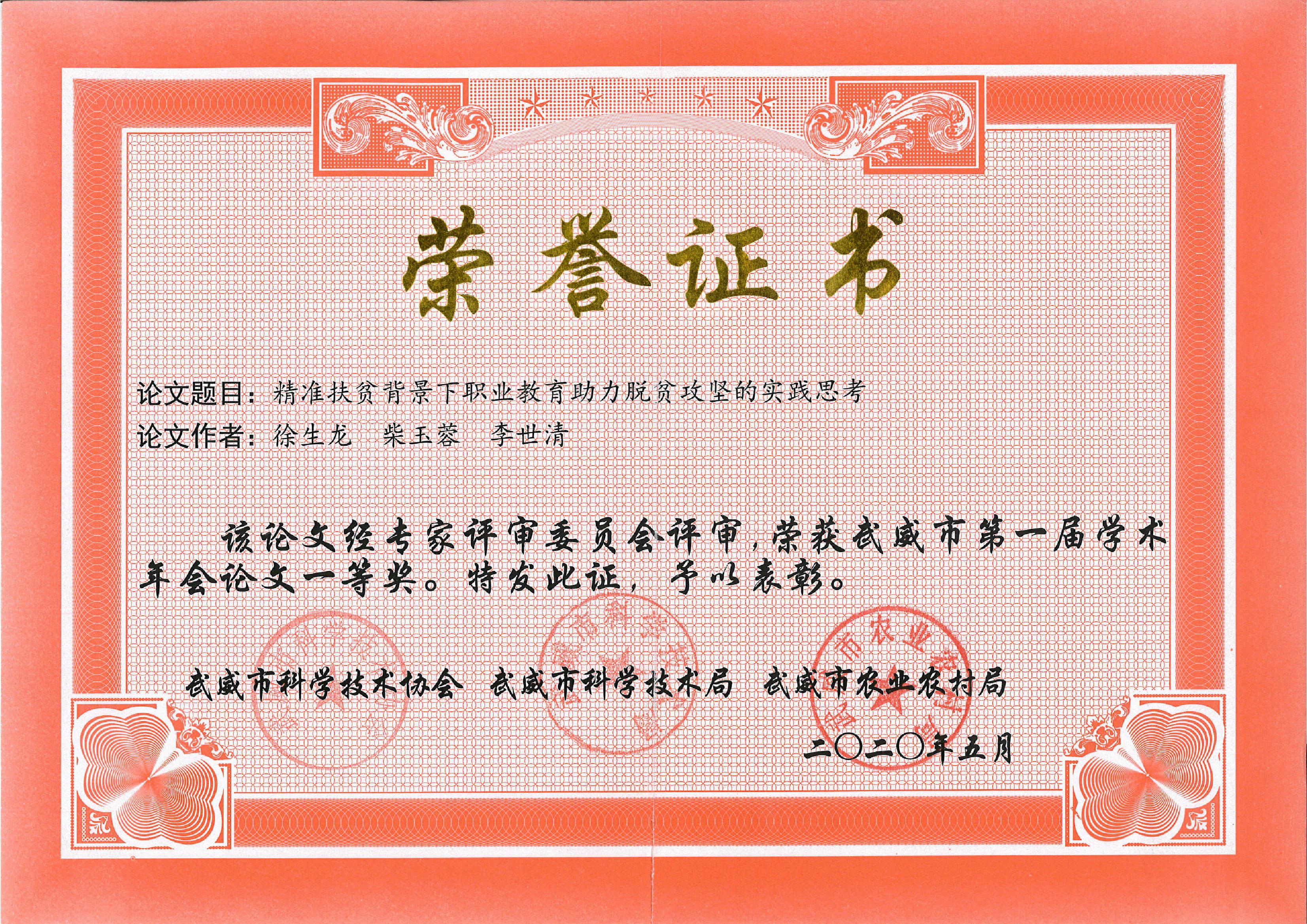 項(xiàng)目組成員徐生龍撰寫的論文《精準(zhǔn)扶貧背景下職業(yè)教育助力脫貧攻堅(jiān)的實(shí)踐思考》被評為武威市第一屆學(xué)術(shù)年會論文一等獎