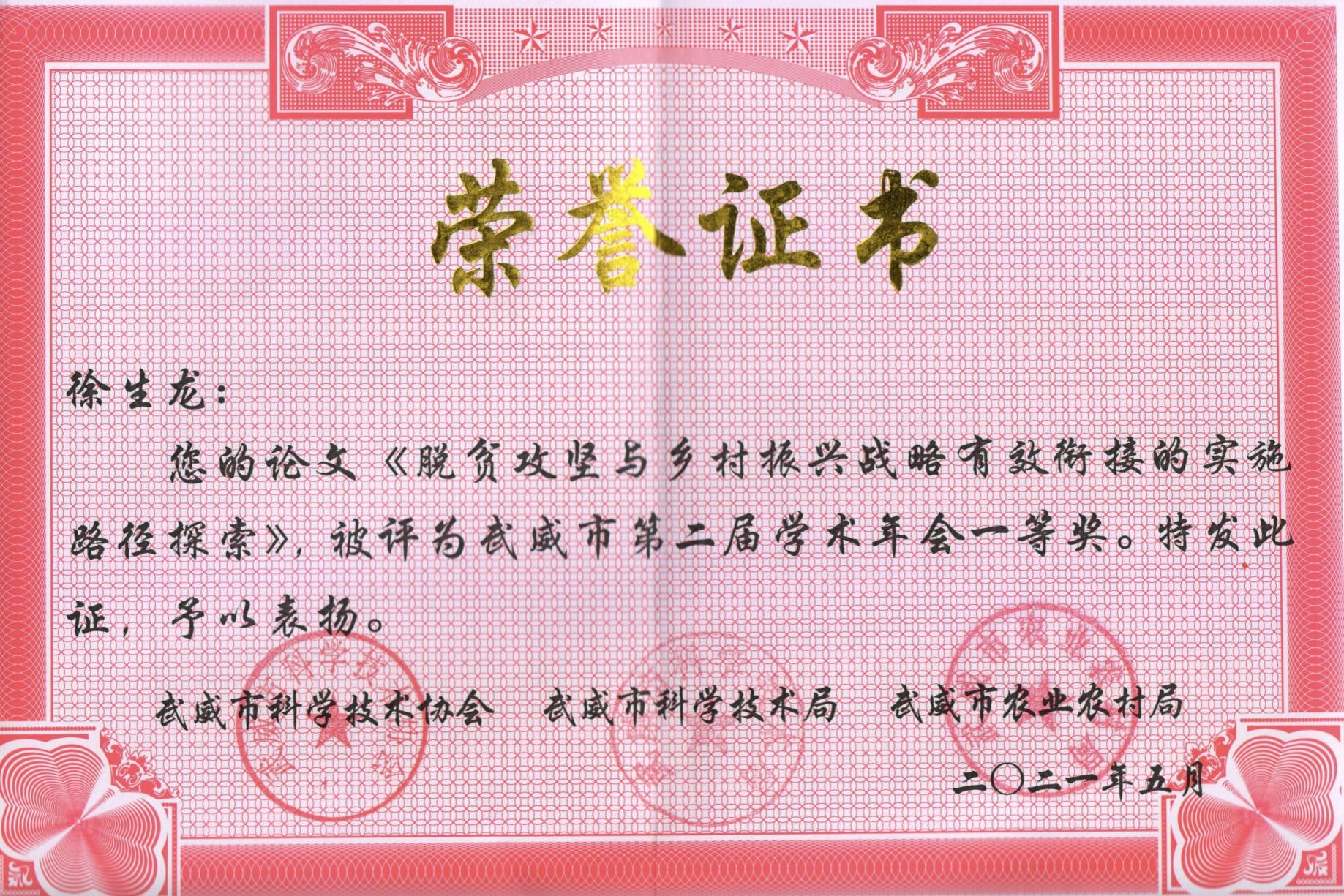 8.項(xiàng)目負(fù)責(zé)人徐生龍撰寫的論文《脫貧攻堅(jiān)與鄉(xiāng)村振興戰(zhàn)略有效銜接的實(shí)施路徑探索》被評為武威市第二屆學(xué)術(shù)年會一等獎