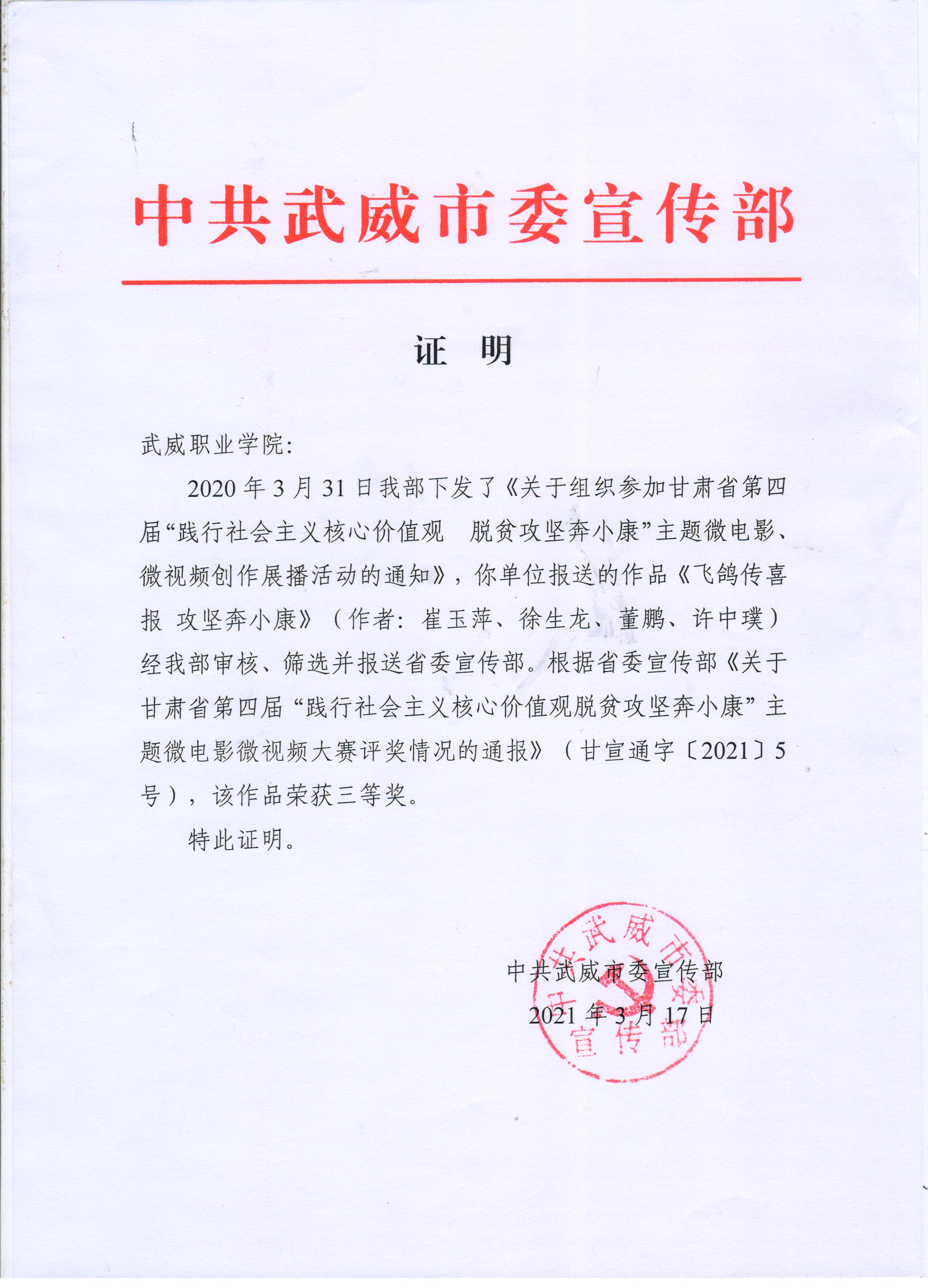 9.項(xiàng)目組負(fù)責(zé)人徐生龍、崔玉萍、董鵬2021年3月制作的《飛鴿傳喜報(bào) 攻堅(jiān)奔小康》在《關(guān)于甘肅省第四屆“踐行社會主義以核心價(jià)值觀脫貧攻堅(jiān)奔小康”主題微電影視頻大賽》榮獲三等獎